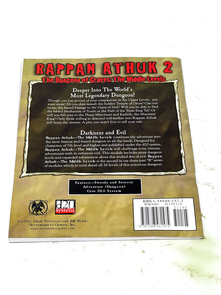ISSUE NOTES - Deeper into the world's most legendary dungeon! Though you lost several of your companions in the Upper Levels, you want more! Do you dare assault the hidden Temple of Orcus? Can you locate the famed Passage to the Gates of Hell? Will you be able to find the fabled Mushroom of Youth or the Hall of the Titan Ereg Tal? Or will you fall prey to the Phase Minotaurs and Kazleth the Minotaur King? Only those willing to descend still further into Rappan Athuk will learn the answer. A pity you won't tell your tale....