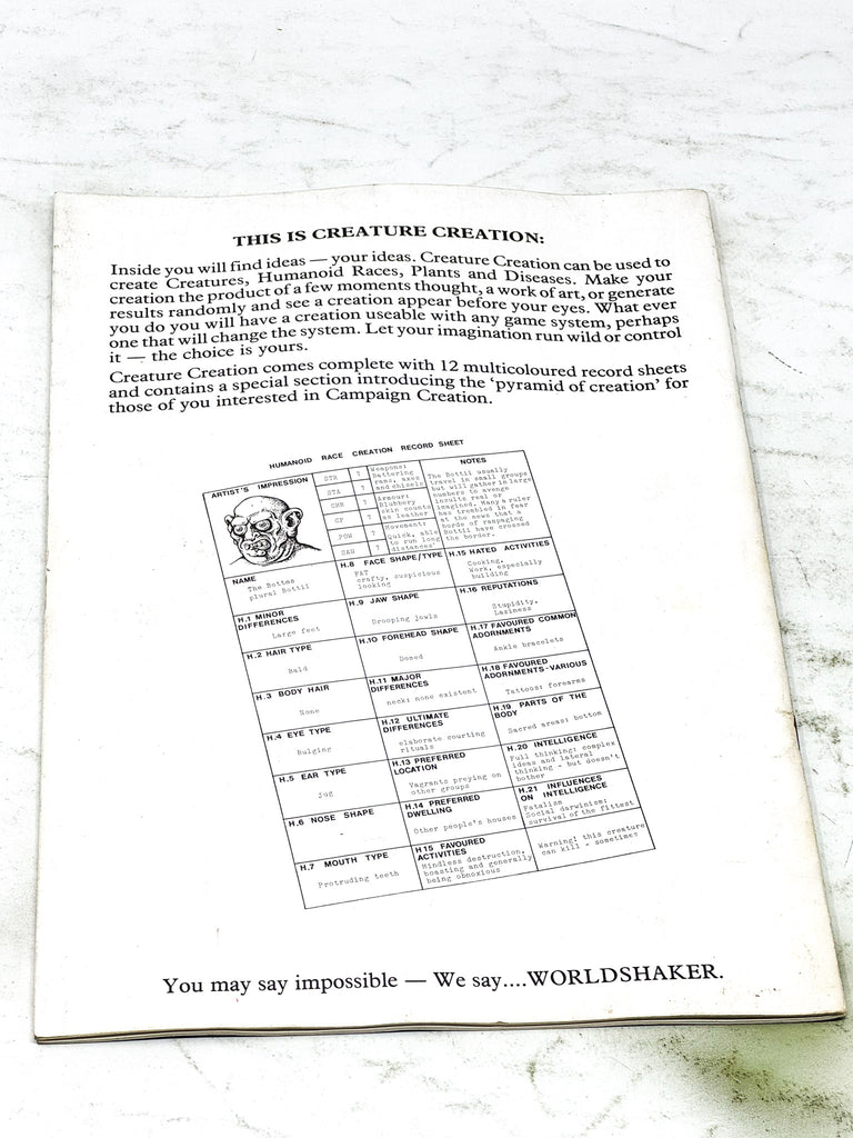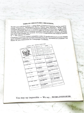 ISSUE NOTES - Creature Creation can be used to create Creatures, Humanoid Races, Plants and Diseases. Make your creation the product of a few moments thought, a work of art, or generate results randomly and see a creation appear before your eyes. Whatever you do you will have a creation useable with any game system, perhaps one that will change the system. Let your imagination run wild or control it - the choice is yours